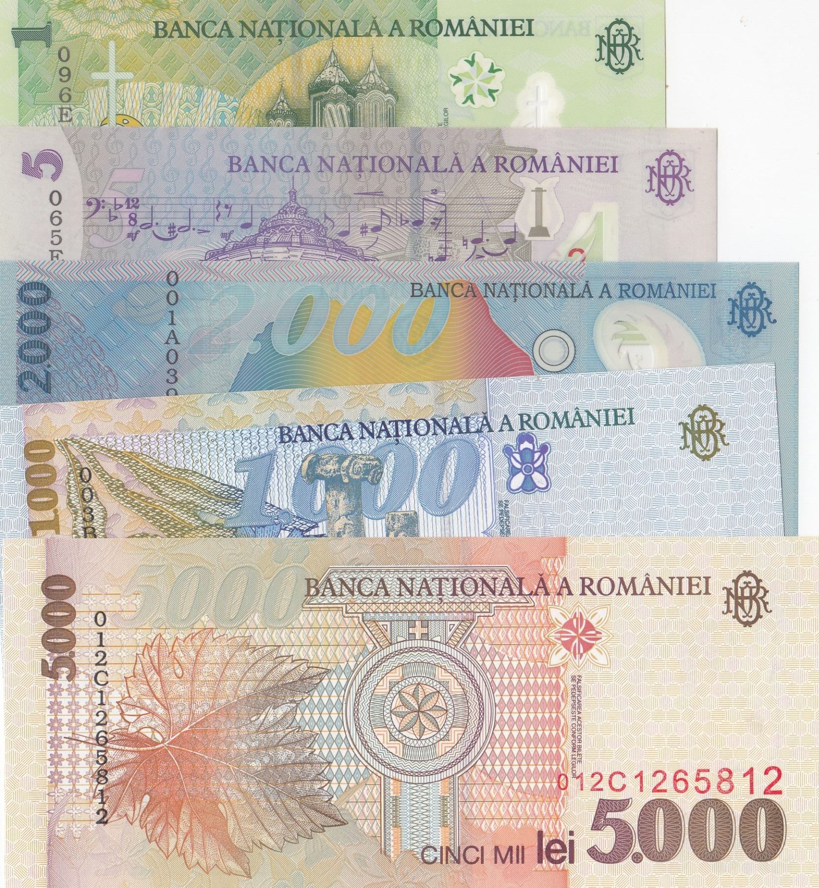 Romania 1 Leu 5 Lei 1 000 Lei 2 000 Lei And 5 000 Lei 1998 2005 Unc Total 5 Banknotes Br 3 O